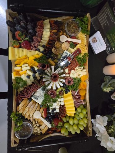 4 Meat, 4 Cheese, Nuts, Fresh & Dried Fruit, Naan, Crackers, or Crostini, Sweets, Gherkins or Olives, Tapenade or Humus, Jam, Honey, Mustard, Tongs, Honey Dipper. Ready To Serve. $75.00